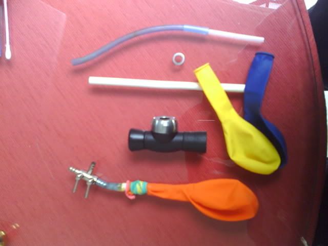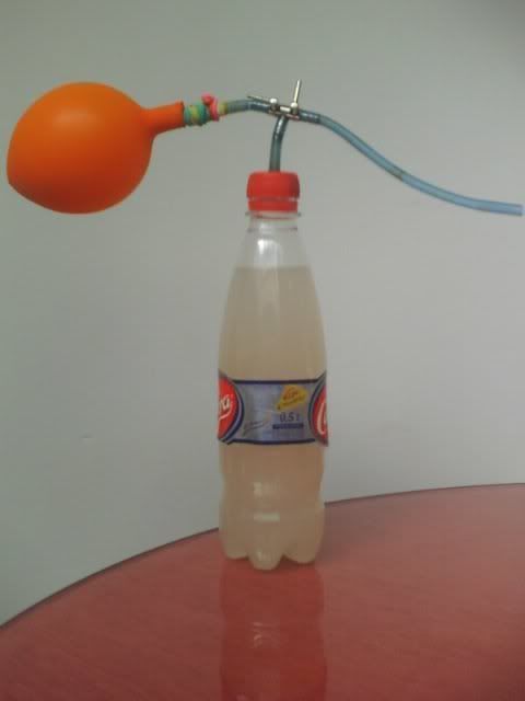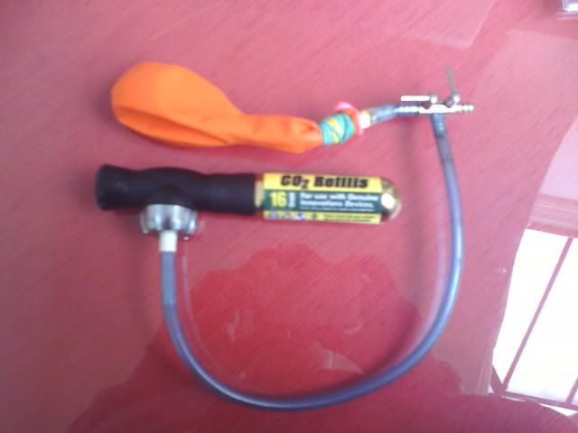 2.- Hagamos una prueba del invento a ver si funciona. Para ello ponemos una carga de CO2 en el inflador, cerramos la llave que llevaría el CO2 al acuario y abrimos la que lleva el CO2 al globo.