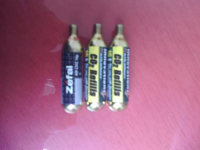 En primer lugar comentaros que este sistema de CO2 se basa en un inflador de cámaras de bicicletas, el cual funciona con unos cartuchos (estándares) de CO2 puro, estos cartuchos contienen 22 cm3 de CO2 bajo presión, su peso neto es de 16 gramos. Los cartuchos son de metal de color dorado.