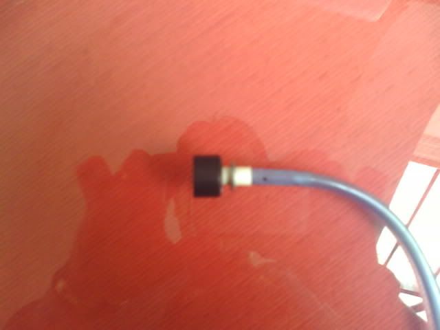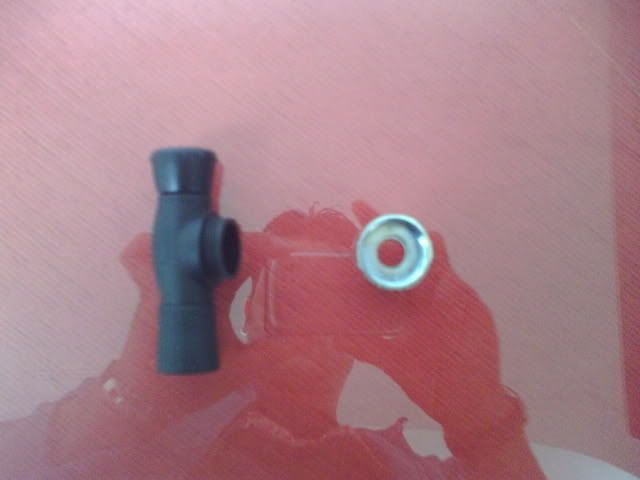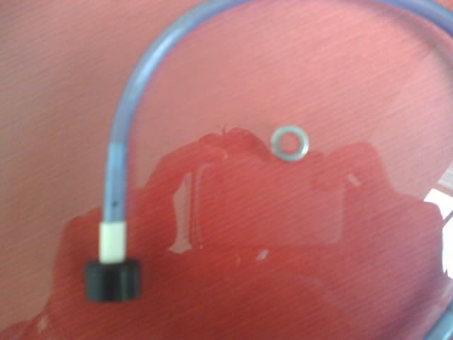 3.- Ahora vamos a poner la aradela en su sitio, no es imprescindible pero si recomendable. La arandela tiene un diámetro interior del tubo de PVC, su diámetro exterior coincide con un rebaje que tiene la pieza metálica que desenroscamos de la boquilla del inflador en el paso primero, el rebaje está por el lado interior de dicha pieza. Ésto es en mi inflador, a lo mejor el que compreis no es asi. Ponemos la arandela en su sitio...